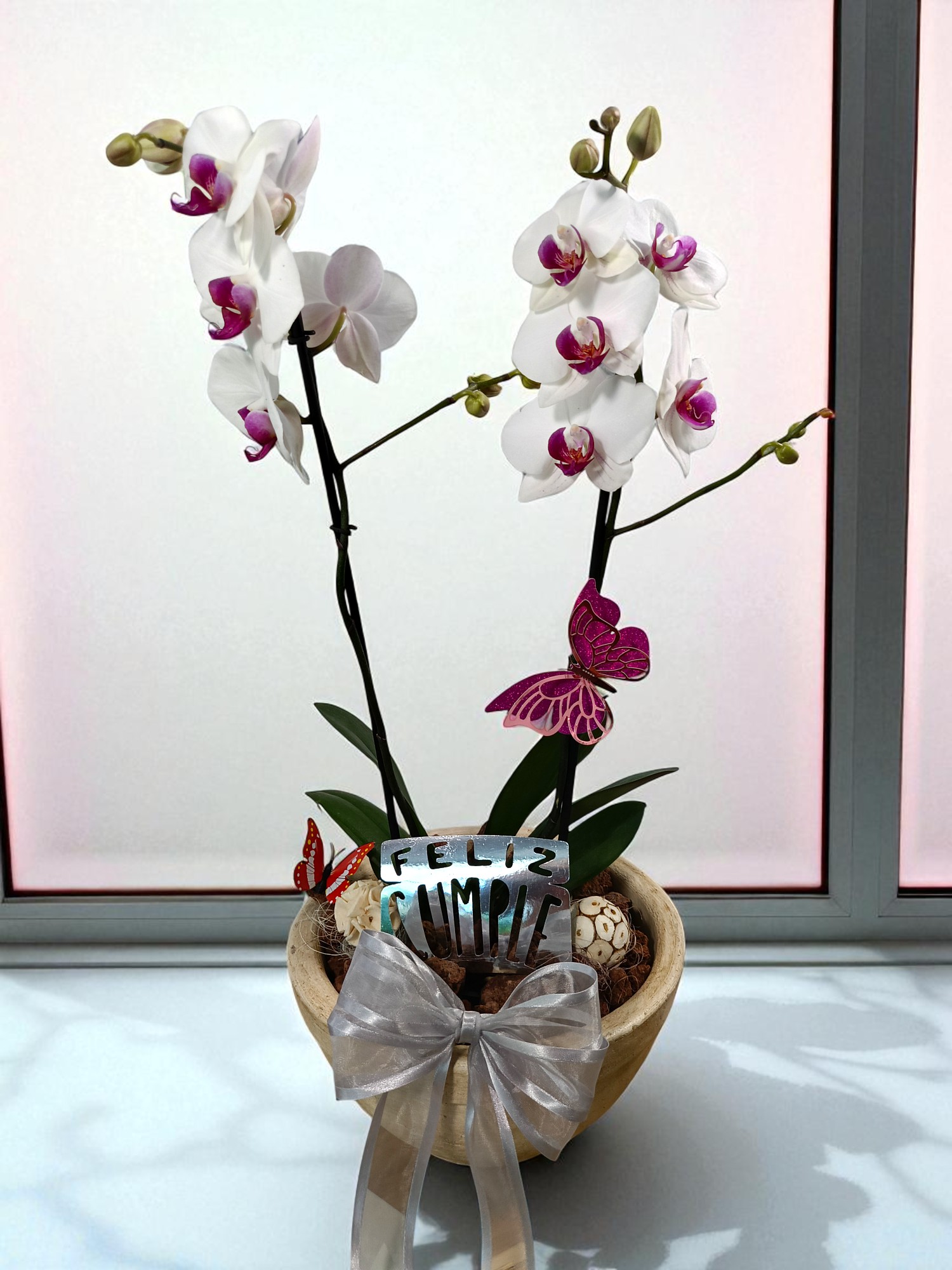 Arreglo floral compuesto por Orquídea Phalaenopsis en floración, montada en una base especial de barro semirrústico beige, decorada con tezontle y mariposas. La combinación de barro, tonos blancos y fucsia está pensada para transmitir cariño, alegría y felicidad. Diseño tal como se muestra en la imagen.